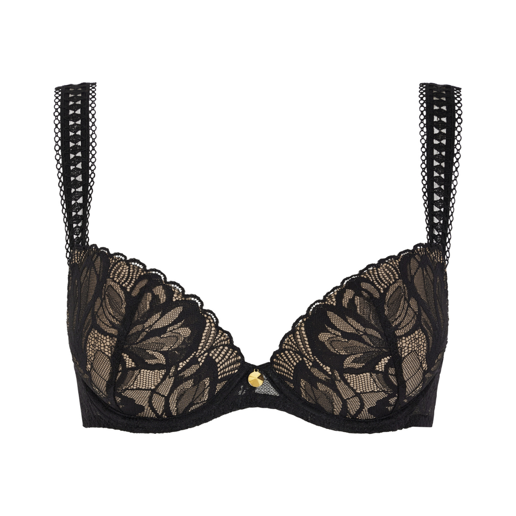 The After Hours padded plunge bra is perfect under a v-neckline. With a light progressive push-up on the B - D cups it gives a great lift and cleavage. The all over floral lace on the beige pad gives a softer look on the body.