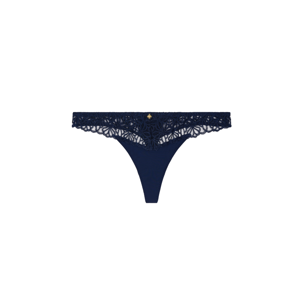The tanga is gorgeous with lace all across the front with a smooth tulle back to ensure that there is no VPL. It sits flush against the body and has a cut out detail at the top of the back accented by a gold bar.