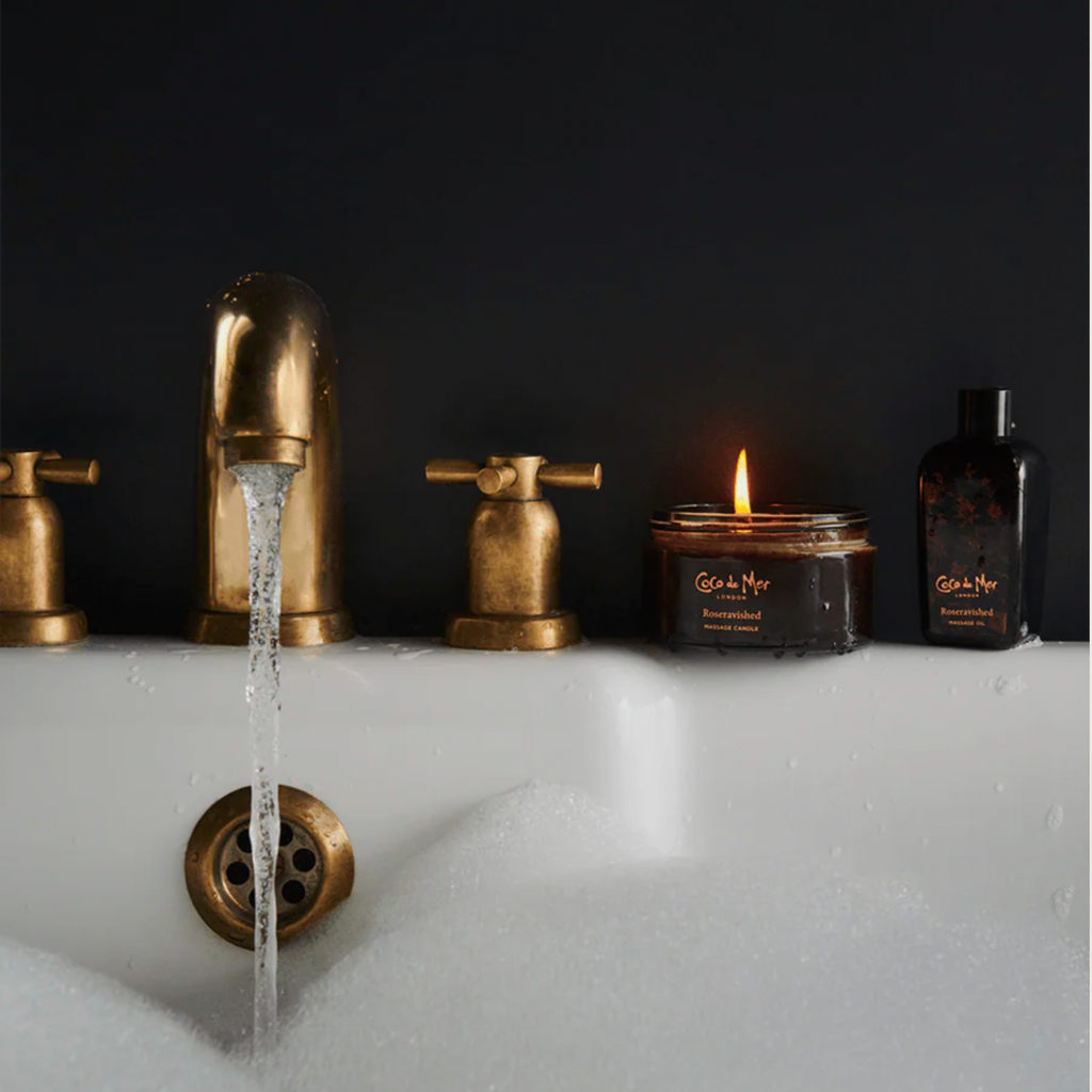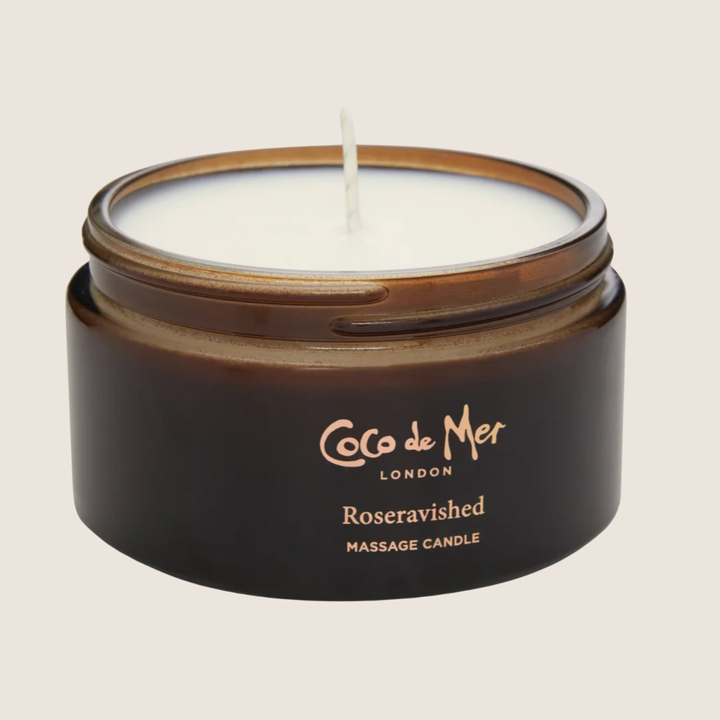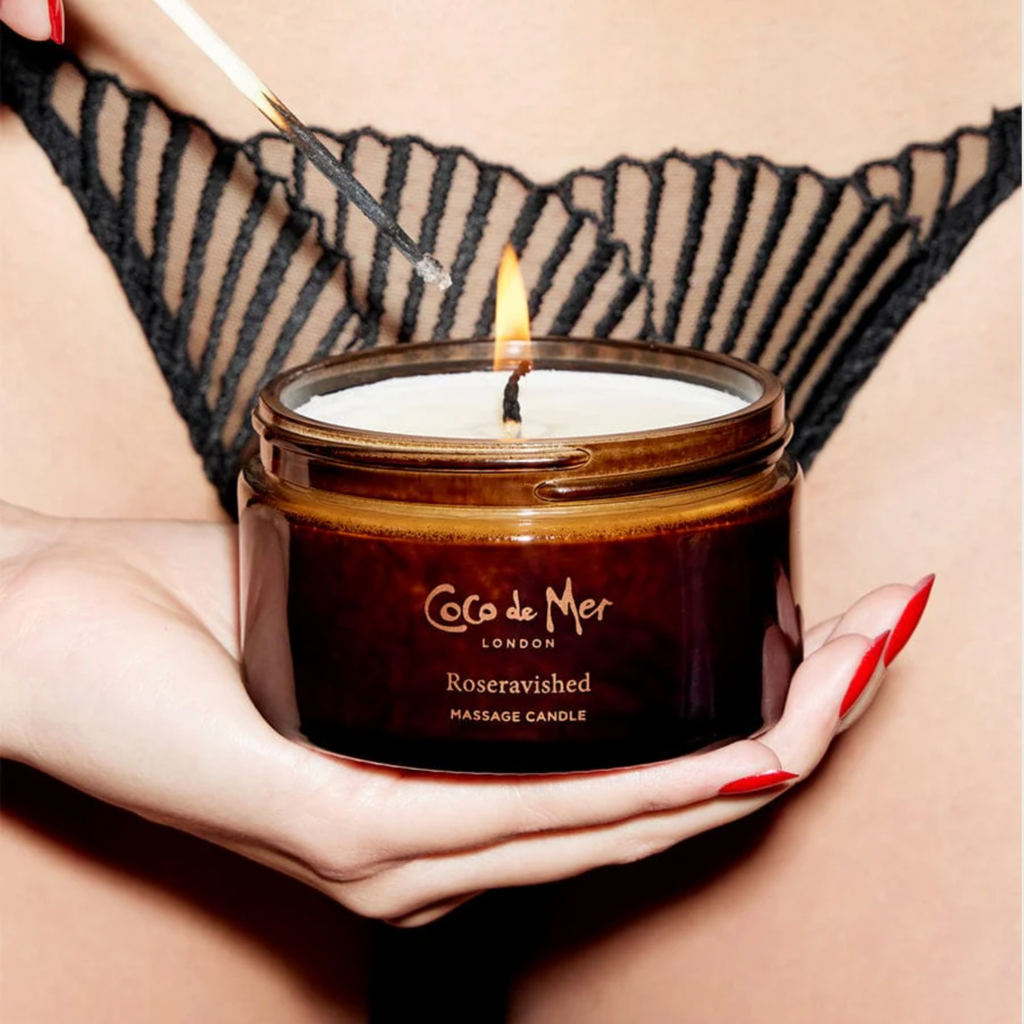 Roseravished massage candle infused with rose and sandalwood turns into a sensual massage oil once you blow out the flame. Let this beautiful scent gently seduce your senses and linger in your mind.