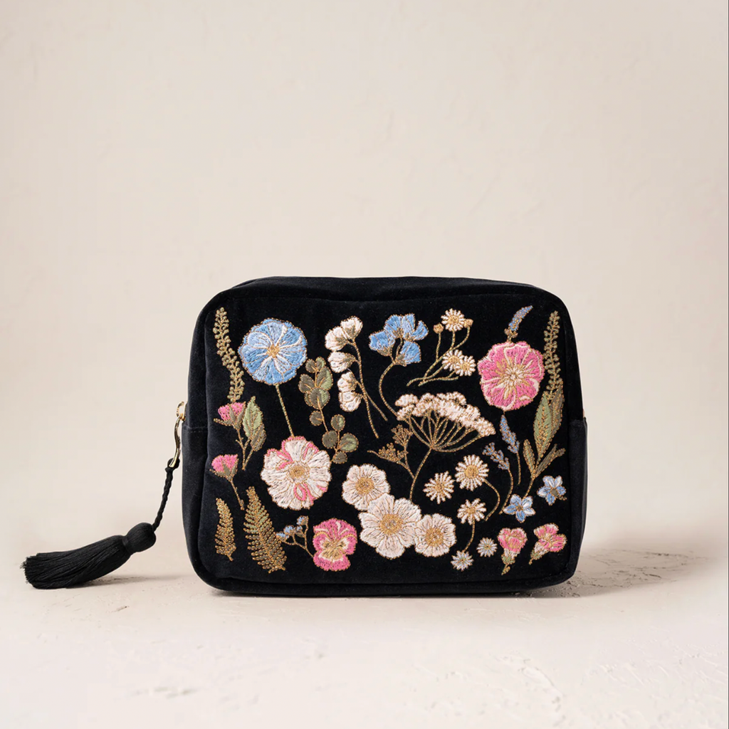 The Pressed Flowers Velvet wash bag in charcoal is gorgeous with enchanted embroidered pressed flowers accented by shining golden threads. Delight loved ones with a touch of botanical magic with this fairytale design.