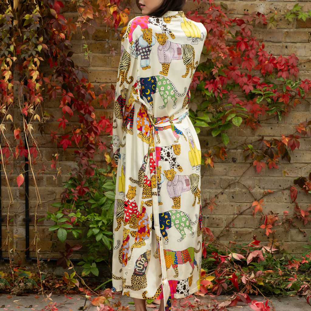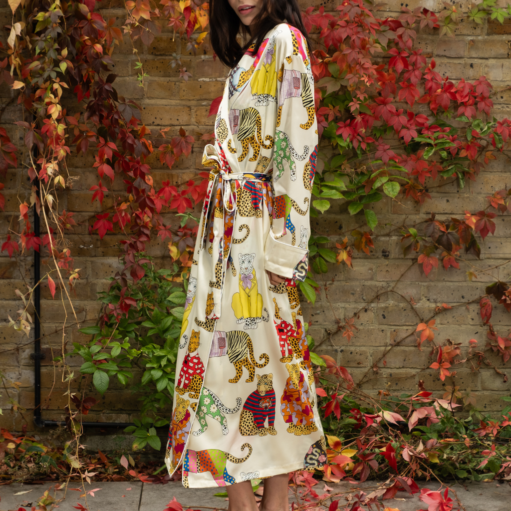 Inspired by the idiom 'Leopards Can't Change Their Spots' this fun exclusive robe from Karen Mabon features Leopards in their best dress. Printed on a beautifully soft silk this robe will have you smiling whenever you wear it.