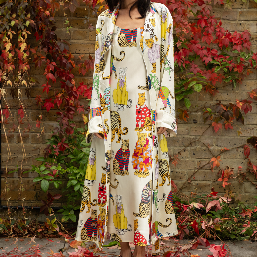 Inspired by the idiom 'Leopards Can't Change Their Spots' this fun exclusive slip dress is for those who love getting dressed up for in and out of the house. The Leopards Can’t Change Their Spots print features pattern mixing leopards ready to walk the runway. Cut on the bias, the dress is midi length and has adjustable straps.