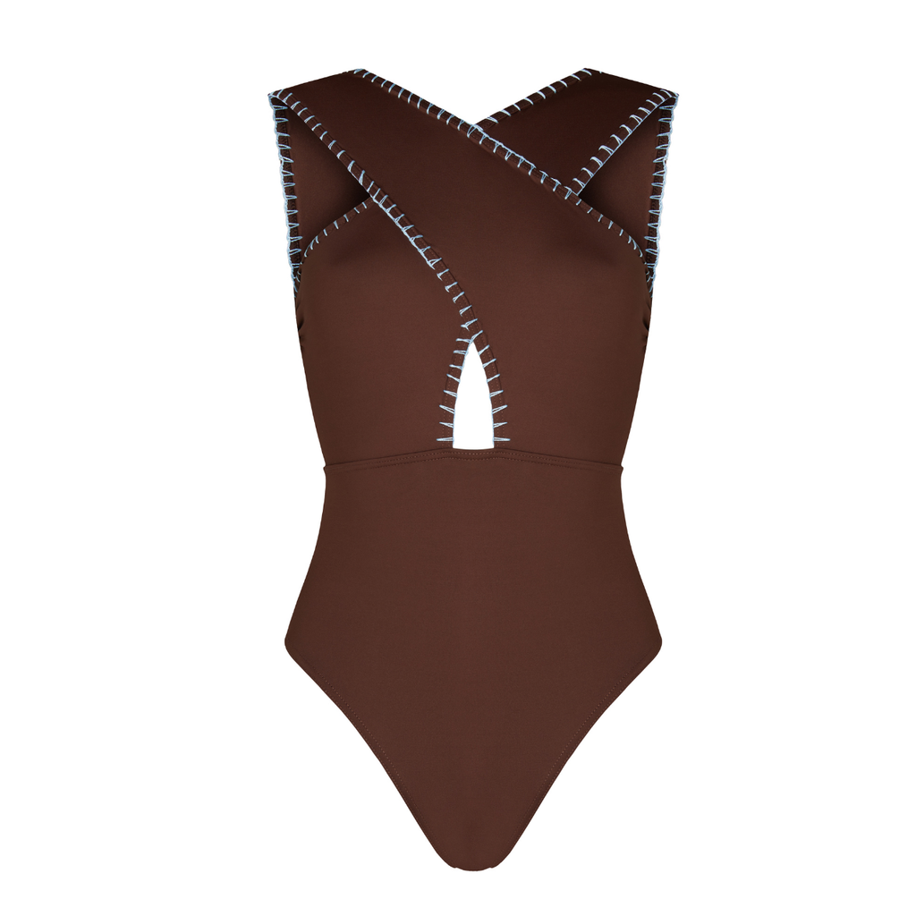 Kióhne's signature CORAL swimsuit in this season’s brown is a true must-have. Designed with bold cross-body straps, it offers supportive structure to the bust, while the open square back adds a refined touch of sophistication. Handcrafted blue embroidery detail along the strap edges creates a striking contrast, making this piece truly special. Universally flattering, the CORAL swimsuit suits every body shape and doubles effortlessly as a top—style it with a skirt or tailored trousers for an elegant evening look.