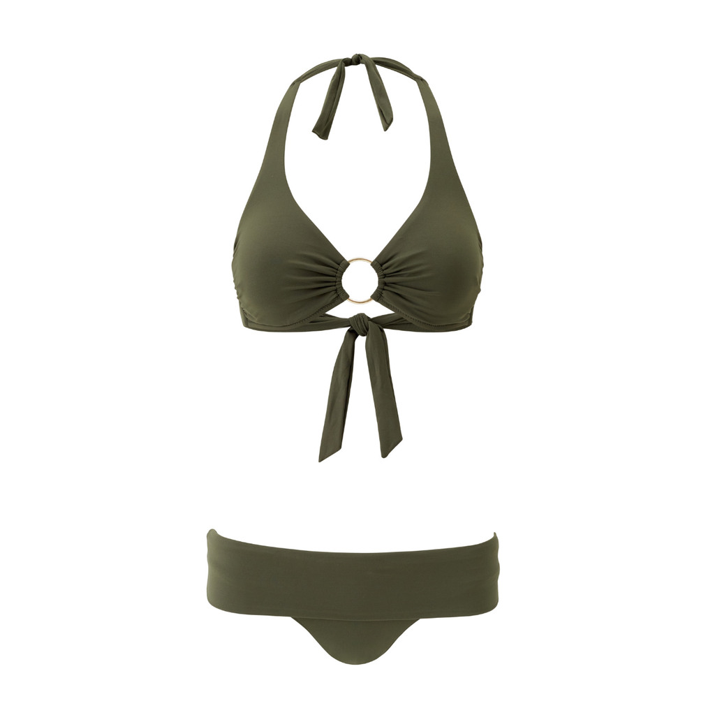 Melissa Odabash's iconic Brussels Bikini in ‘Olive’. The unpadded, underwired halterneck top gives you support where you need it, while the tie back allows you to achieve the perfect fit. A golden ring at the bust bridges the gap between girlish and glam, with the matching bikini bottoms offering a little extra coverage thanks to the fold-over finish.