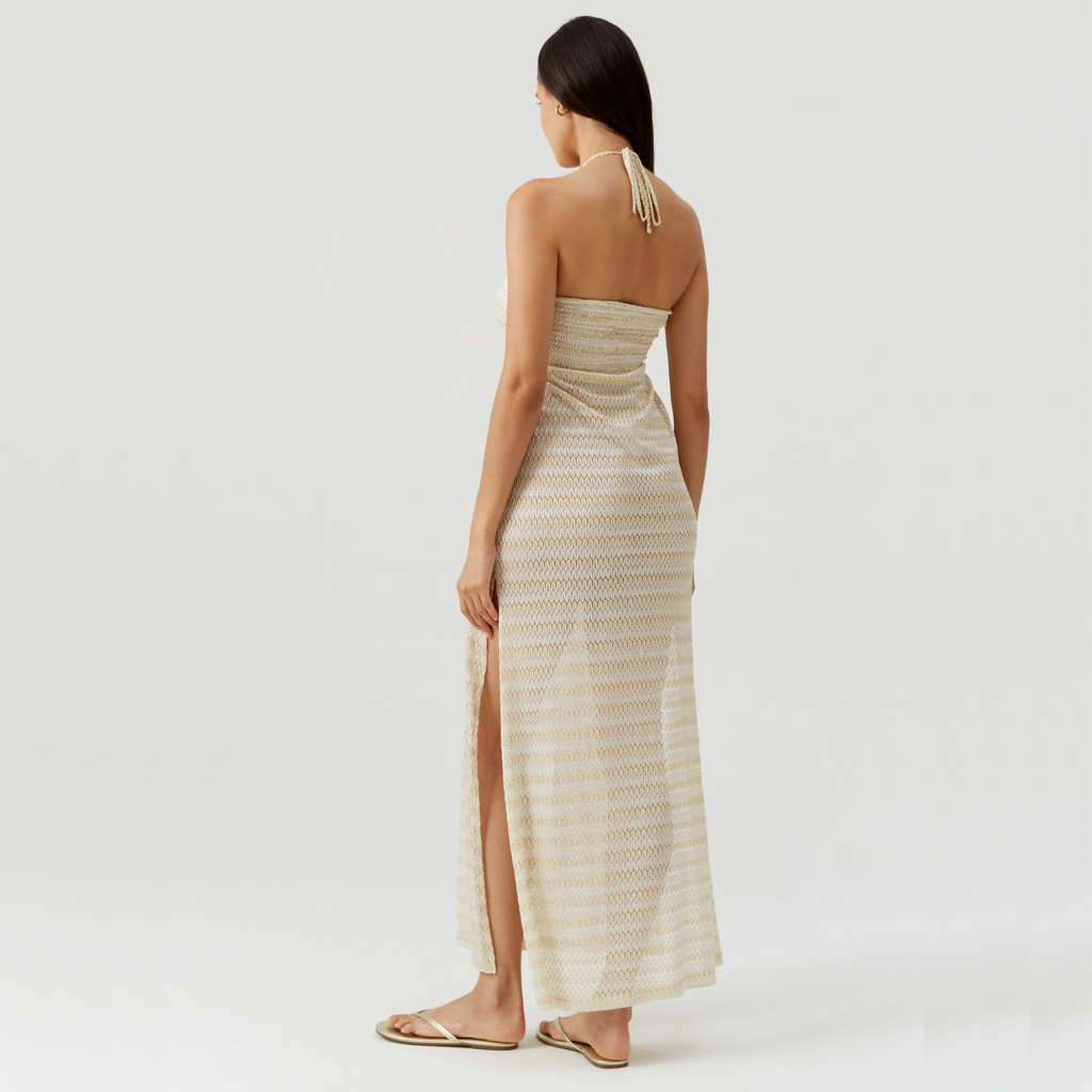 Melissa Odabash's Mila Halter Neck Knit Dress is stunning in 'Gold'. The bandeau style dress with neck tie falls from the bust in a gently flared style to a maxi length. The soft open knit fabric is lined over the bust. This dress will go with all your swim wardrobe and will have you glowing.