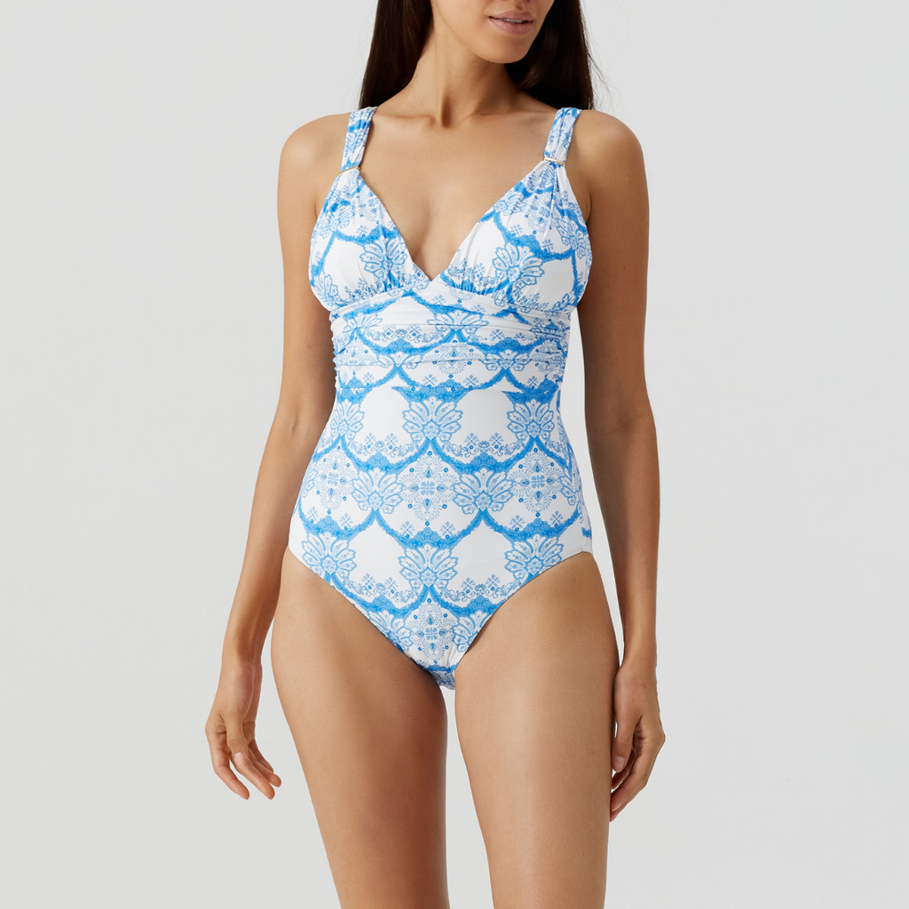 Melissa Odabash's Panarea Medina Swimsuit is fully lined so the swimsuit traces the contours of the body for a supreme fit. The Panarea has a deep flattering v-neckline which it met by a wide band of ruching under the bust.
