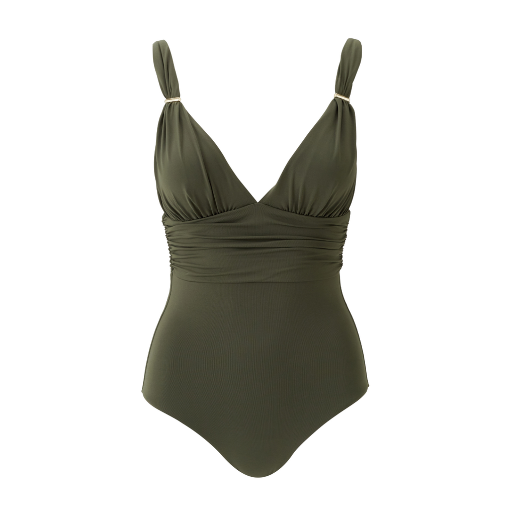 Melissa Odabash's Panarea Olive Swimsuit is fully lined so the swimsuit traces the contours of the body for a supreme fit. The Panarea has a deep flattering v-neckline which it met by a wide band of ruching under the bust.