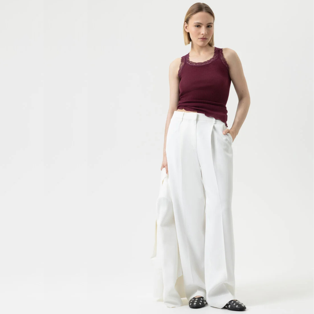 The tank top has a lace lined round neckline and rolled hem. The top is perfect all year round, either as a top paired with trousers, as loungewear with your favourite joggers or as a base layer on those colder days.