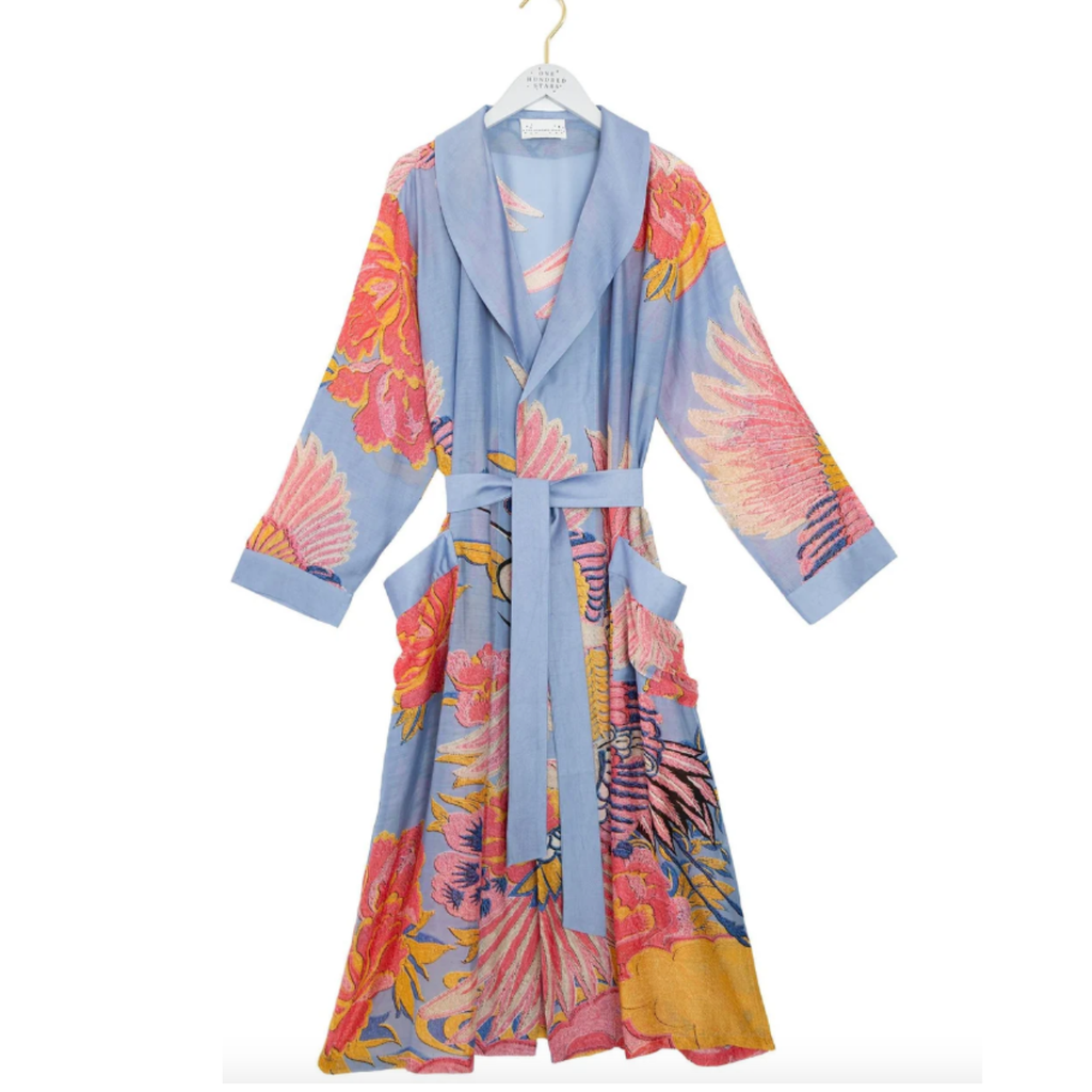 One Hundred Stars Crane Periwinkle Gown is the perfect addition to your loungewear wardrobe. The crane symbolises good fortune in many cultures, and this vibrant print is something to celebrate. The print is inspired by classic French Toile De Jouy fabrics but with a twist.