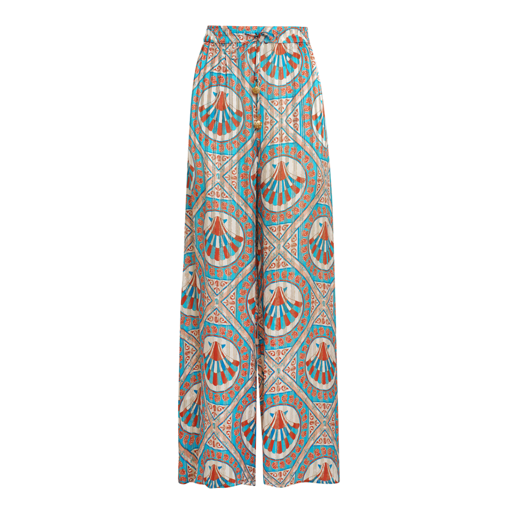 The Ceramica Alma Trousers are a high waisted loose wide leg style. The drawstring elasticated adjustable waist gives maximum comfort for days out on holiday eating out, lounging around or exploring. The silk fabric feels amazing against your skin and they can easily be dressed up or down.