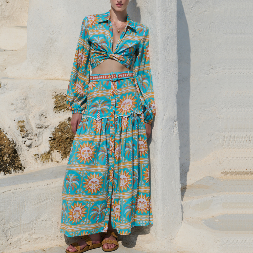 The Sole Mio Wrap Top is a stunning long sleeved v-neckline collared shirt. You can tie it in different ways giving the style of cropped you prefer and it pairs perfectly with the matching skirt and shorts.