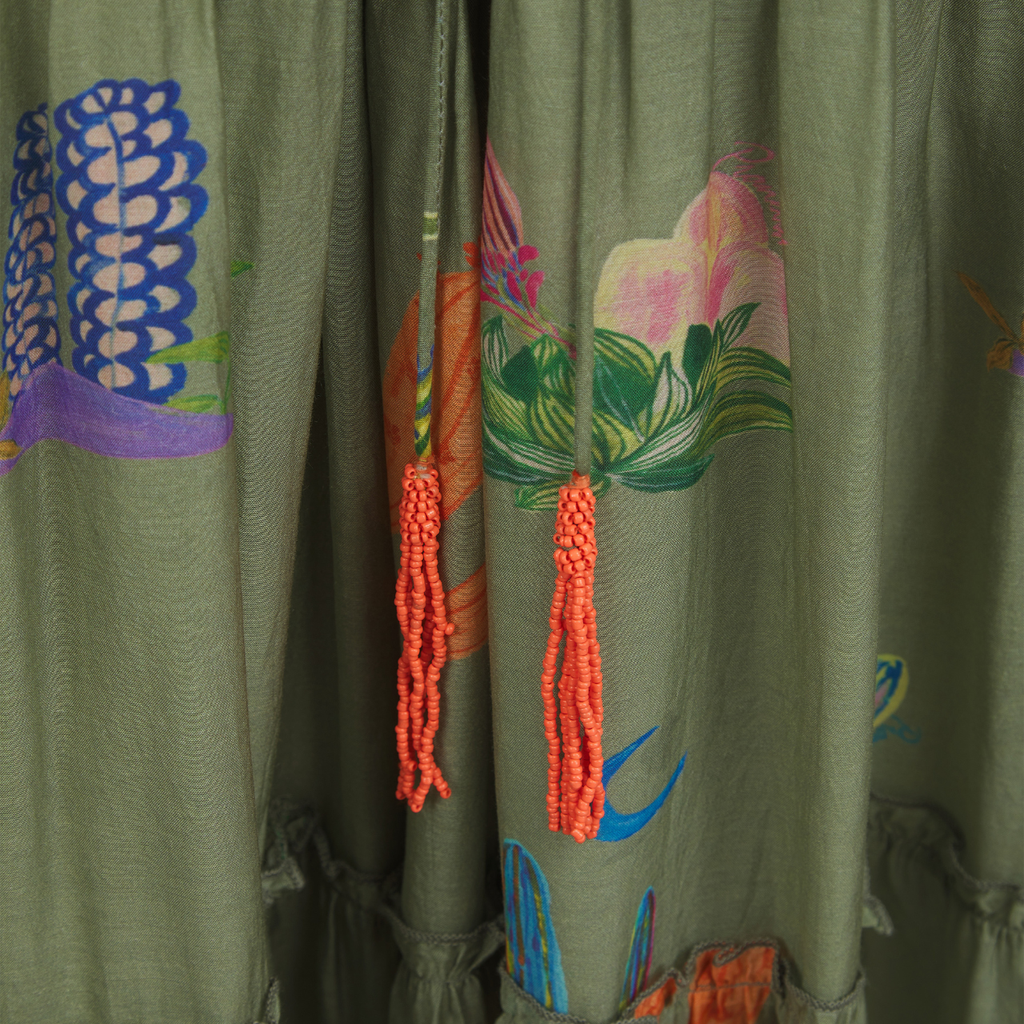 Pranella's Rachel Maxi Dress is fresh for SS26 in the on trend Khaki colour with a gorgeous print. The floaty and light fabric falls and flatters the figure beautifully creating an elegant look. The added draw sting waist allows for a flexible fit creating a flattering figure and making this Pranella dress an easy to wear maxi dress.