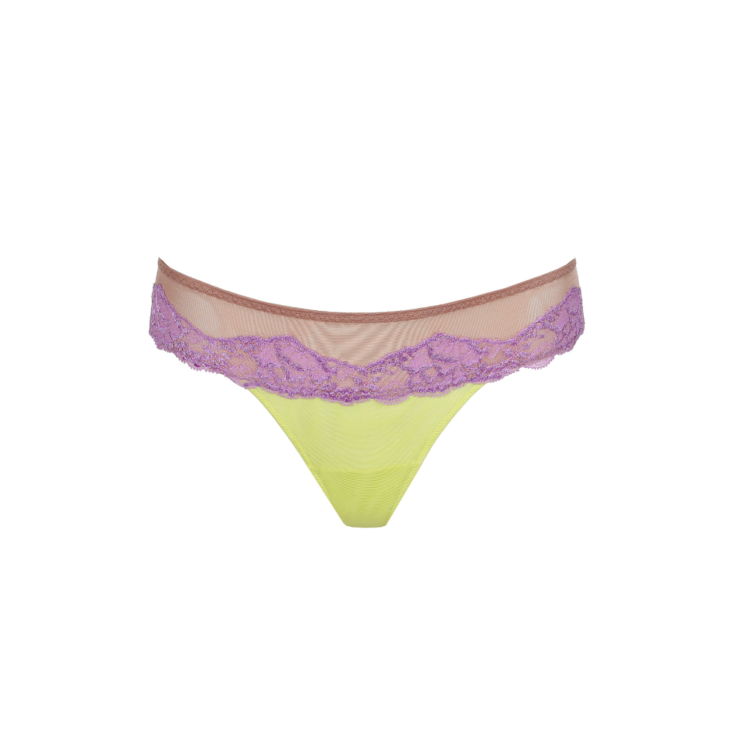 The thong sits on the hips flush against the body. The floral lace and semi-sheer tulle give a romantic feel.