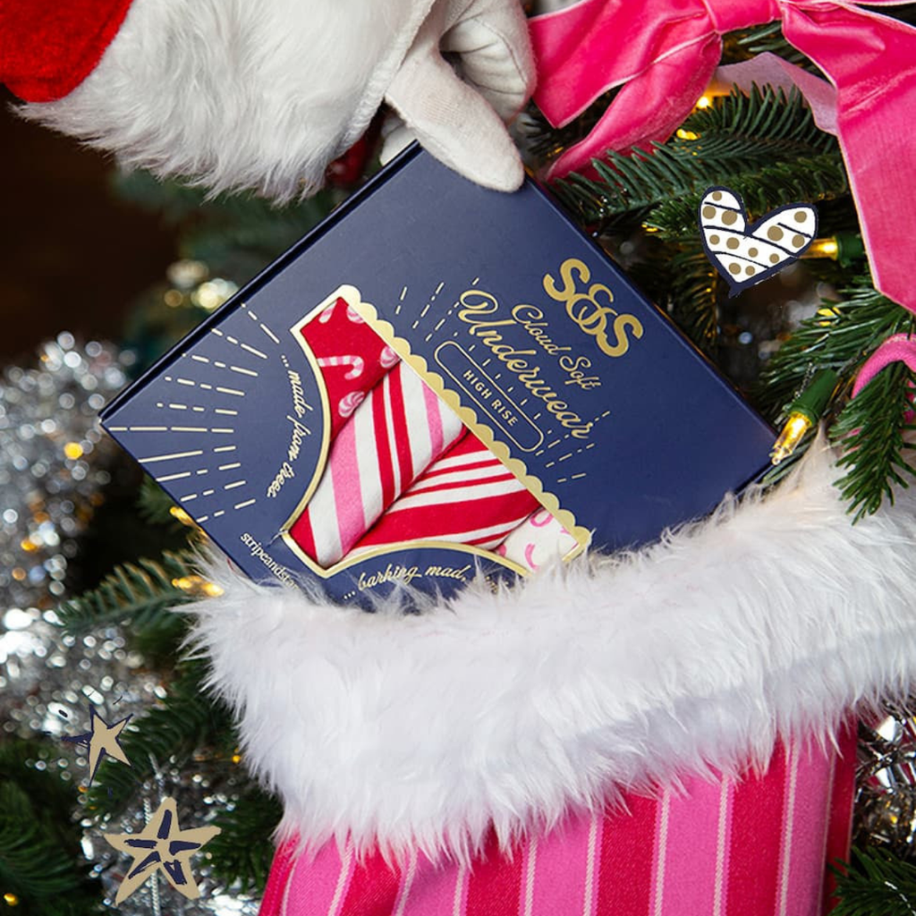 Stripe & Stare's Candy Cane wishes high rise knicker box contains 4 super fun festive knickers in stripes, pink bows and candy canes, all with beautiful soft lace trim. Together in their festive box, this makes a perfect Christmas gift!