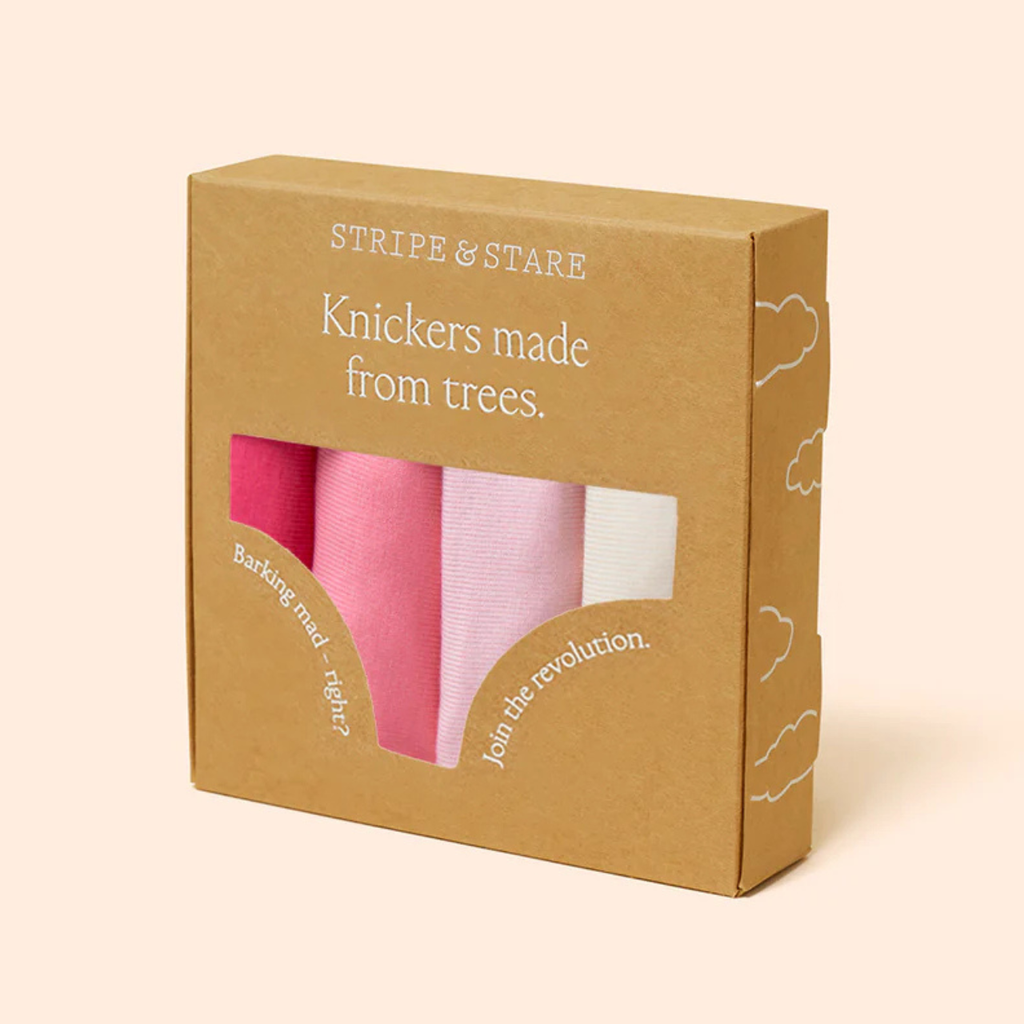 Stripe & Stare's Coconut Ice knicker box contains 4 knickers in Coral Paradise, Geranium Pink, Almond Blosson and Buttercream with contrasting buttercream lace. Put together in a box they make the perfect gift.